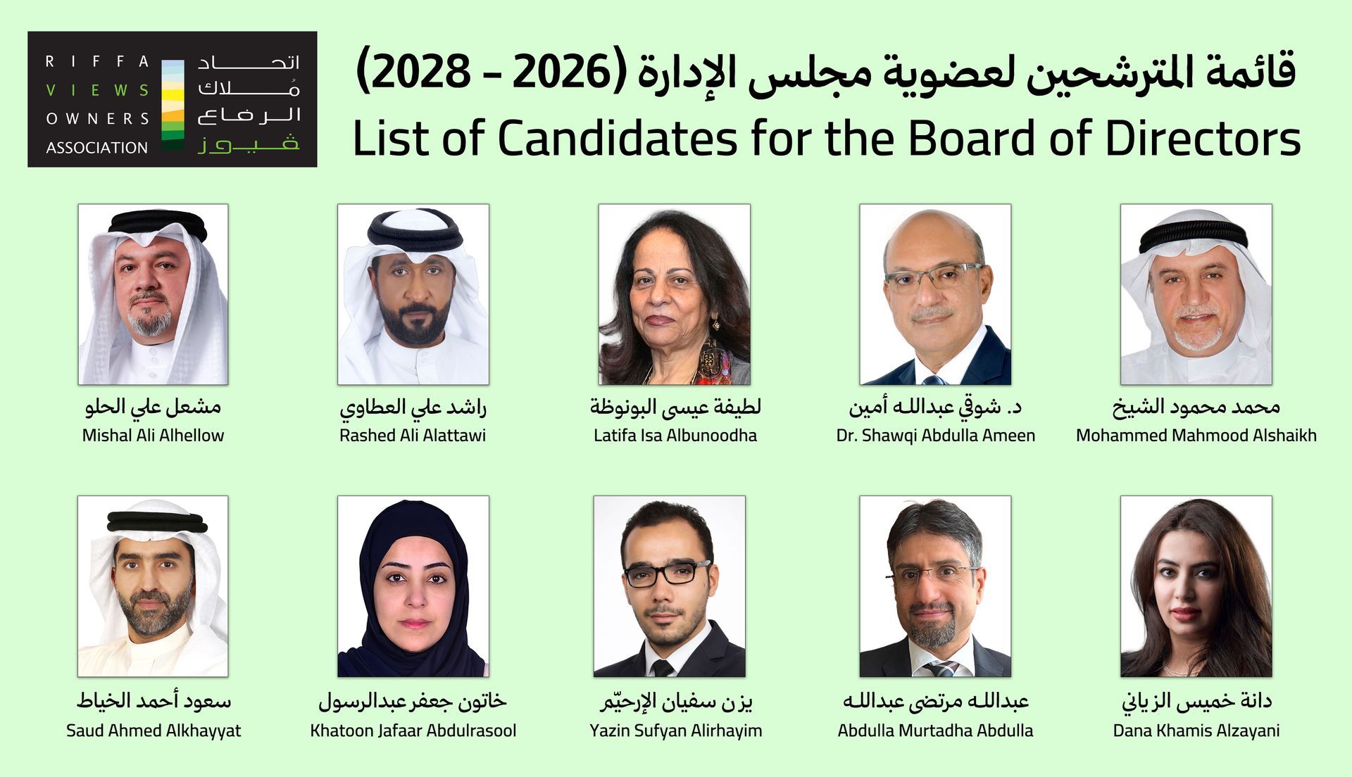 We are pleased to announce the list of candidates for membership of the Board of Directors of the Riffa Views Owners Association for the fourth term (2026-2028), as follows: